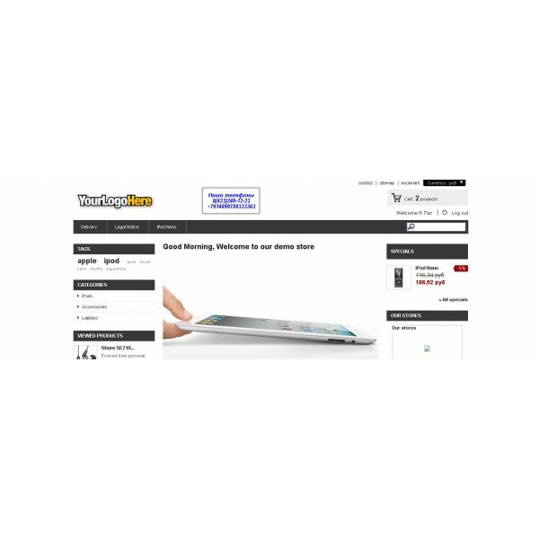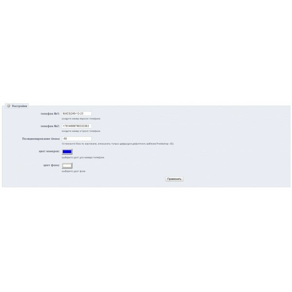 Модуль позволяет указать номера контактных телефонов вашего магазина в шапке сайта. В данной версии ввести возможно один или два номера. Есть возможность изменять цвет номеров и фона в блоке - это поможет вам подобрать стиль блока с телефонами к дизайну вашего шаблона.