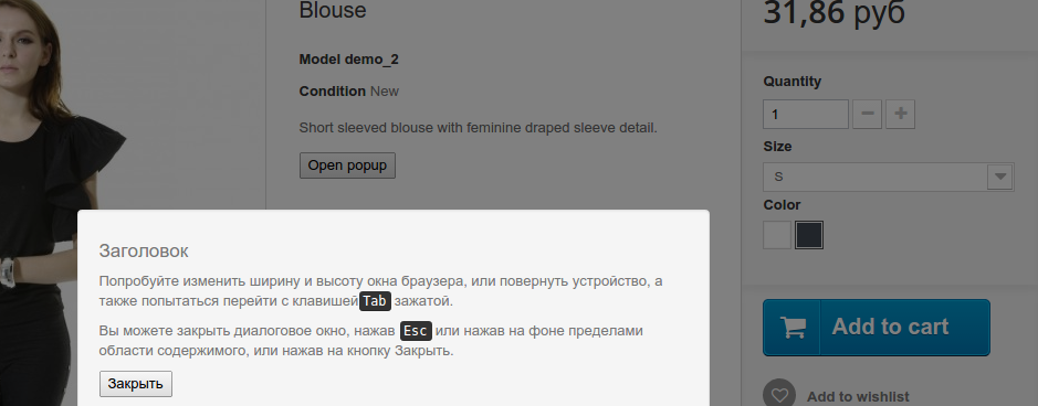 <button class="my_popup_open">Open popup</button><div id="my_popup"> <h4>Заголовок</h4> <p>Попробуйте изменить ширину и высоту окна браузера, или повернуть устройство, а также попытаться перейти с клавишей<kbd>Tab</kbd> зажатой.</p> <p>Вы можете закрыть диалоговое окно, нажав <kbd>Esc</kbd> или нажав на фоне пределами области содержимого, или нажав на кнопку Закрыть.</p><button class="my_popup_close">Закрыть</button> </div>