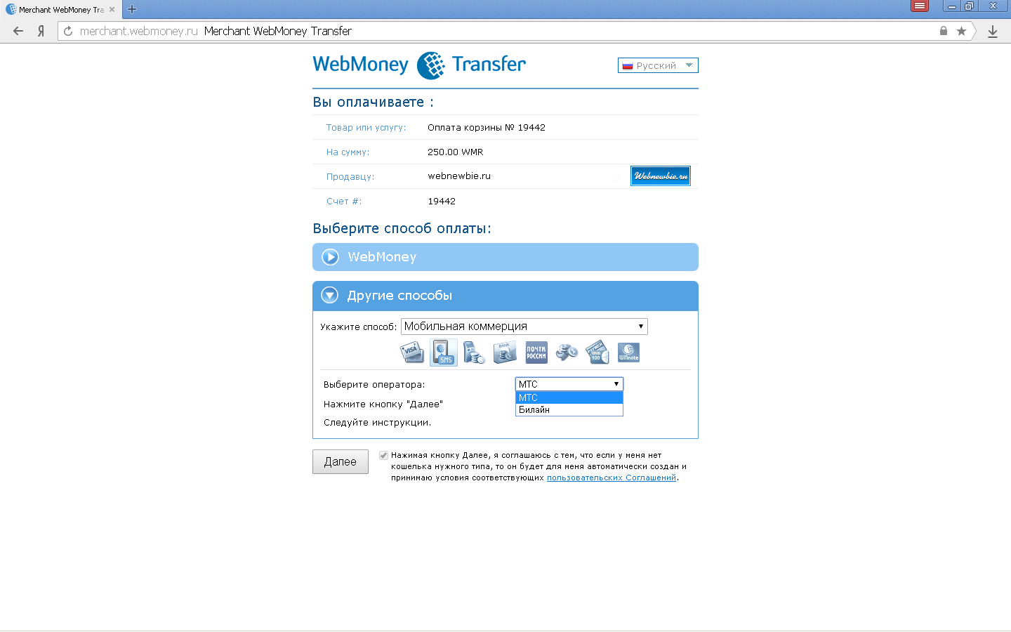Если выбрать способ оплаты мобильная коммерция, то нужно определиться и с оператором связи. Доступны только МТС и Билайн