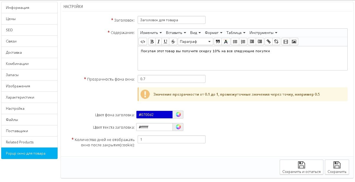 - Настройки по типу активации модального окна модуля "Popup окно для товара" проводяться на странице модулей. А основные настройки модального окна на странице редактирования товара во вкладке Popup окно для товара