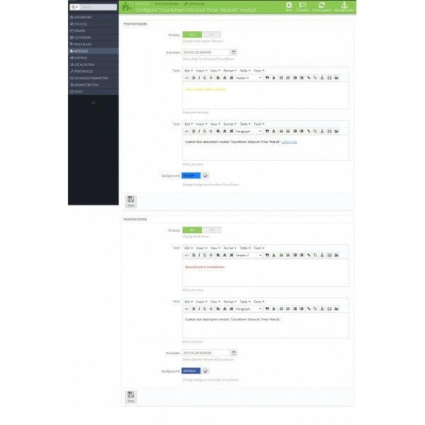 Просто но так эффективно !!! Этот модуль предоставляет Вам возможность, показать вашим клиентам, что акционное предложение истекает! Это очень удобно. Если у вас есть продукт по специальной цене и он ограничен по времени для этой цены, вы должны иметь таймер обратного отсчета. Кроме того, он необходим, когда у вас есть скидки или распродажи в течение некоторого периода времени. Этот таймер покажет посетителям, сколько времени осталось до завершения акции, поторапливая их купить акционный продукт. Вы можете настроить вид модуля изменив фон на подходящий для вашего магазина и добавьте свой собственный текст и ссылку на продукт или другую важную информацию.
